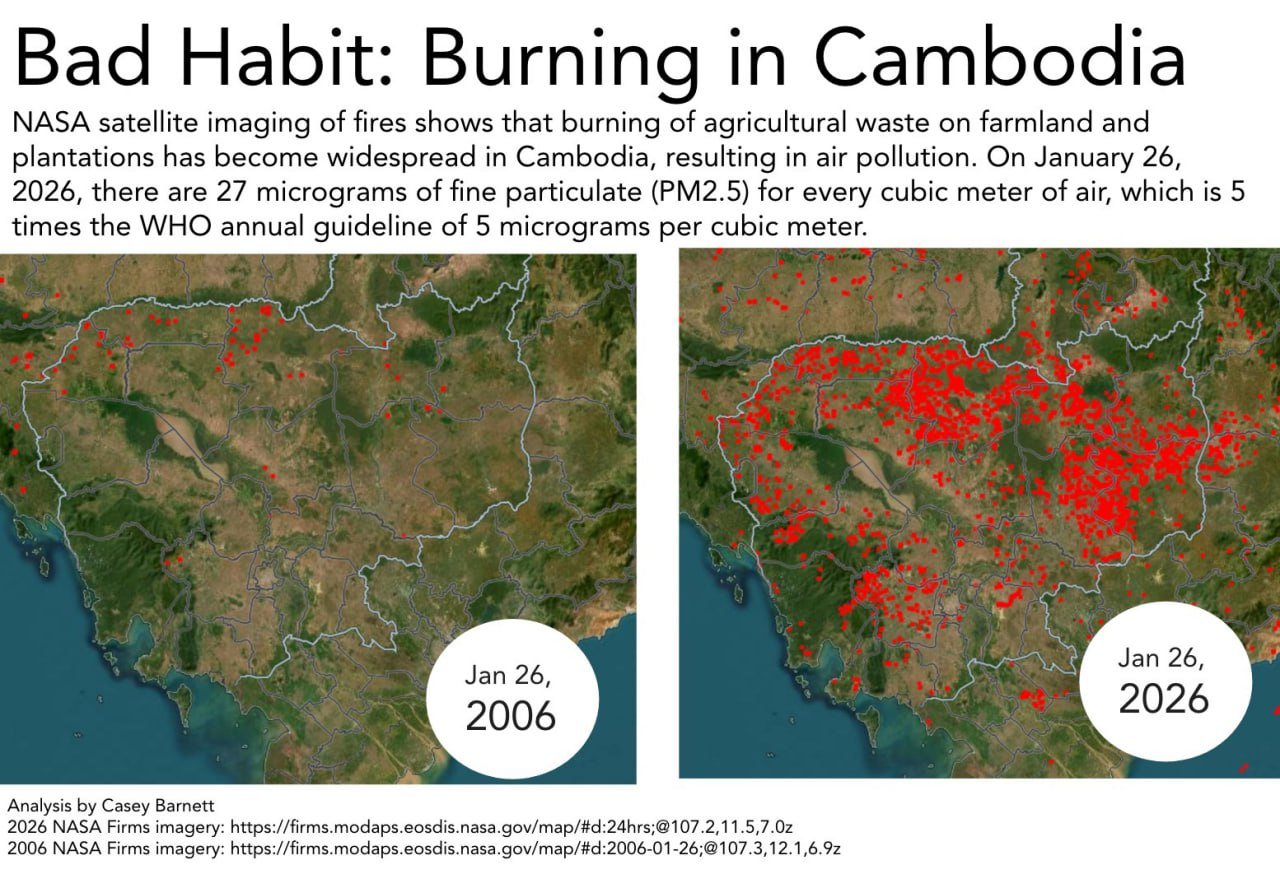 លោក កាសេ បាណែត (Casey Barnett) ប្រធានសភាពាណិជ្ជកម្មសហរដ្ឋអាមេរិក ប្រចាំនៅកម្ពុជា បានបង្ហោះសារ នៅលើគណនីបណ្ដាញសង្គមហ្វេសប៊ុក កាលពីថ្ងៃអង្គារ ទី២៧ ខែមករា ឆ្នាំ២០២៦ ថា ផ្កាយរណបរបស់អង្គការណាសា (NASA) បានបង្ហាញ ថា ការដុតកាកសំណល់កសិកម្ម នៅលើដីកសិកម្ម និងចម្ការ បានរីករាលដាលយ៉ាងទូលំទូលាយ នៅក្នុងប្រទេសកម្ពុជា ដែលបណ្តាលឱ្យមានការបំពុលខ្យល់។