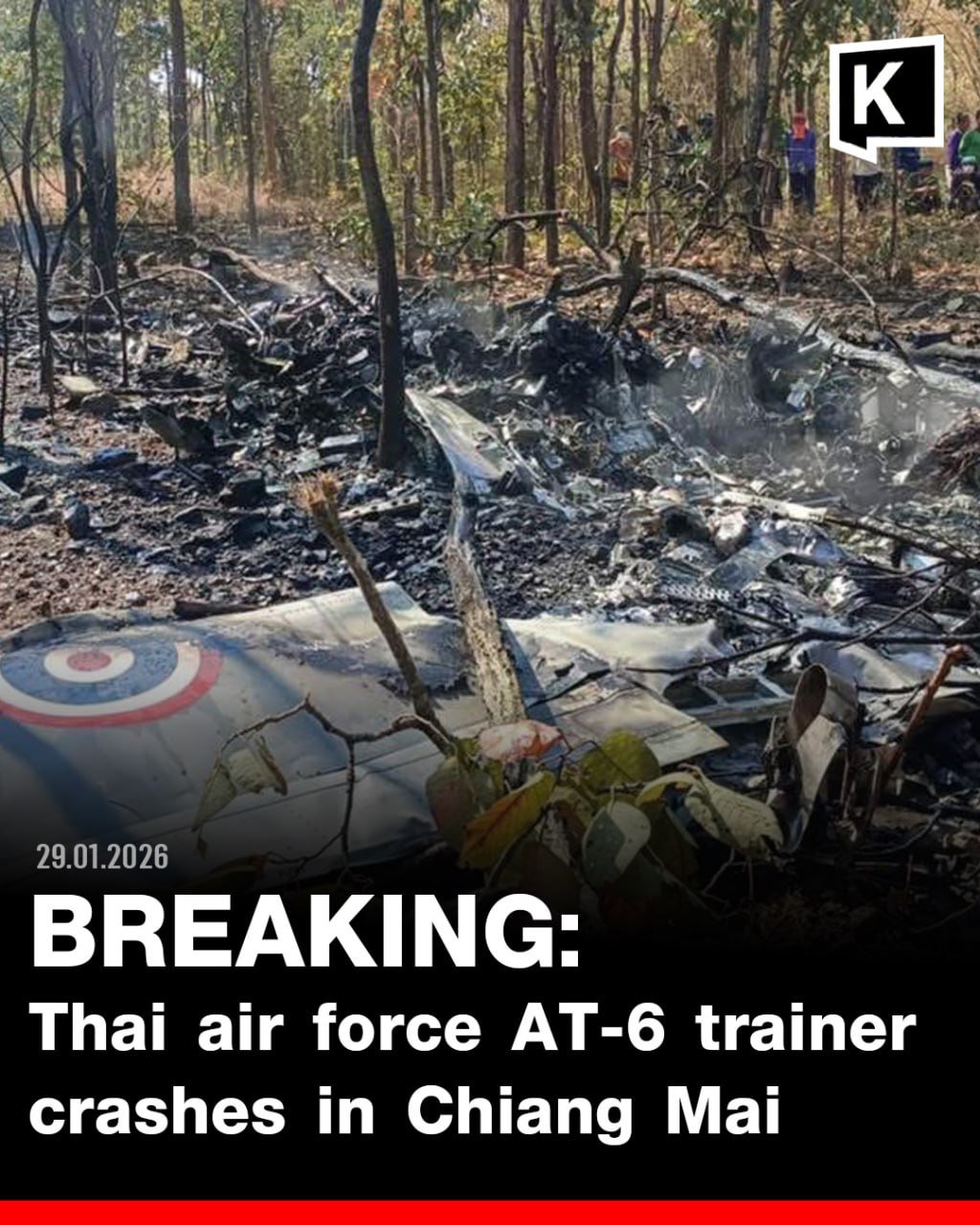 រាជធានីបាងកក៖ សារព័ត៌មានចិនស៊ីនហ៊ួ បានរាយការណ៍ ថា យន្តហោះមួយគ្រឿងរបស់កងទ័ពអាកាសភូមិន្ទថៃ (RTAF) ប្រភេទ AT-6 បានធ្លាក់ក្នុងអំឡុងពេលហ្វឹកហ្វឺន នៅភាគខាងជើង ប្រទេសថៃ កាលពីវេលាម៉ោង១០ និង ៣០នាទីព្រឹក ថ្ងៃព្រហស្បតិ៍ទី២៩ ខែមករា ឆ្នាំ២០២៦ នៅភូមិហួយ ហ្វាង ( Huai Fang) ស្រុកជុំថុង (Chom Thong) ខេត្តឈៀងម៉ៃ នាភាគខាងជើង នៃប្រទេសថៃ។